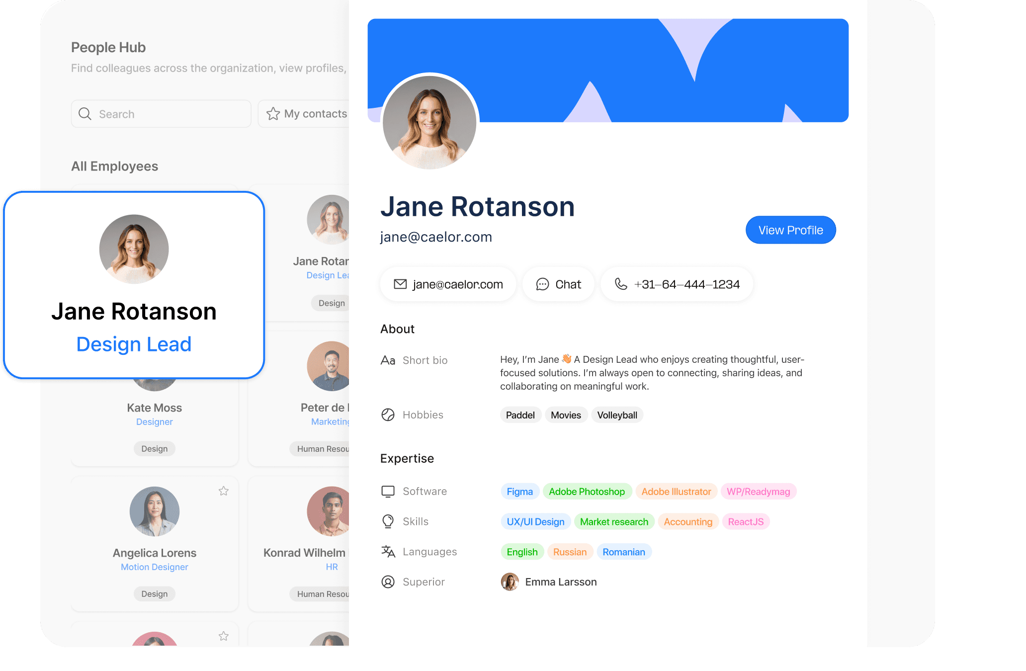 Explore your intranet in full detail and find exactly what you're looking for. Use intuitive search and filters in each hub to browse events, sort news by category or date, or connect with people by team, role, or location.